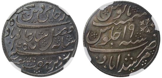 India, British India, East India Company, Bengal Presidency, Calcutta Mint: Second milled issue, silver Proof Rupee in the name of 'Shah 'Alam II (AH 1173-1221/1759-1806), no hegira date, frozen regnal yr 19 [1793-1818], naming Murshidabad, sikka zad bar haft kishwar saya fazl ilah hami din muhammad shah alam badshah [defender of the religion of Muhammad, Shah 'Alam emperor, shadow of the divine favour, put his stamp on the seven climes], no private marks, rev. zarb murshidabad sanah 19 julus maimanat manus [struck at Murshidabad in the 19th year of his reign of tranquil prosperity], edge grained right, 11.66g, 12h (Prid. 160 [Sale, lot 613]; Stevens 4.19; cf. KM. 108). Brilliant and practically as struck, deeply toned, very rare. NGC PF63. NGC Certification 6382526-023 Provenance: Ex Puddester Collection, Part One, Noonans, 8-9 February 2023, Lot 669 P. Snartt (Bristol, UK) Collection Spink Numismatic Circular (London) April 1980 (3119), ticket. |