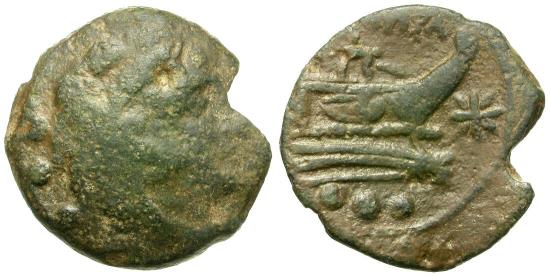 Head of Hercules right, wearing lions skin headdress; (mark of value) behind; [club below neck truncation]