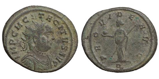 TACITUS (275-276). Antoninianus. Siscia. 23 mm, 3,66 gr. Obv: IMP C M CL TACITVS AVG. Radiate and cuirassed bust right. Rev: PROVIDE AVG / Q. Providentia standing left, holding globe and sceptre. RIC V online 3825. Traces of Silvering. XF