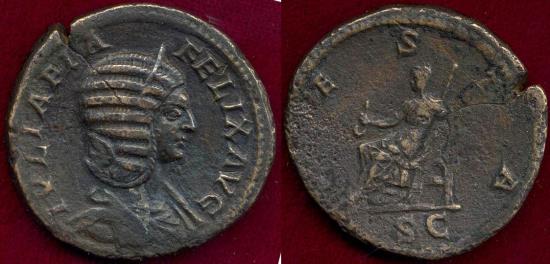 AE Sestertius 32mm wife of Septimius Severus O:draped bust Julia Domna facing right R:Vesta seated with simpulum & sceptre Catalog reference: RIC 593