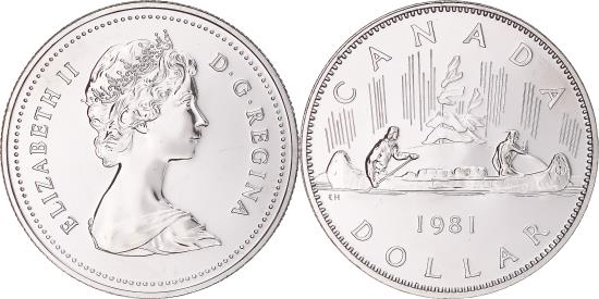 | | Coin, Canada, Elizabeth II, Dollar, 1981, Royal Canadian Mint, Ottawa, BU | | | Young bust right, Voyageur, date and denomination below, Modified design., Arnold Machin | | FEATURES |