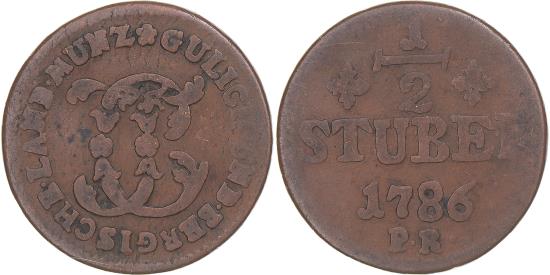 | | Coin, German States, JULICH-BERG, Karl Theodor, 1/2 Stüber, 1786, | | | Floriated monogram, Value, date | | FEATURES |