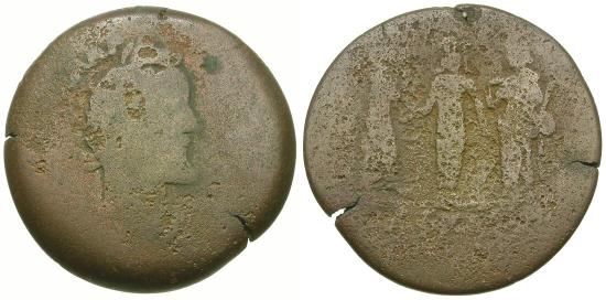 Apollo of Miletus standing facing between two Nemeses of Smyrna; L ΔЄKATOY (date) in exergue