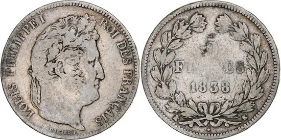 | | Coin, France, Louis-Philippe, 5 Francs, 1838, Bordeaux, , Silver | | | Louis-Philippe, Laureate head right, Mint marks at edge outside wreath | | FEATURES |