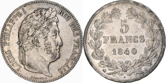| | Coin, France, Louis-Philippe, 5 Francs, 1840, Rouen, , Silver | | | Louis-Philippe, Laureate head right, Mint marks at edge outside wreath | | FEATURES |