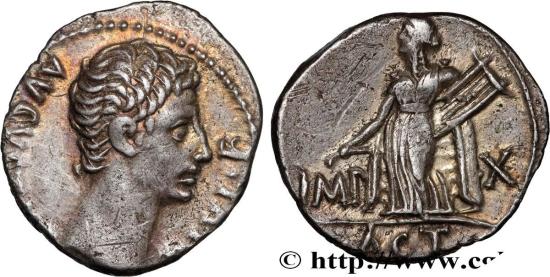 IMP - X// ACT à lexergue Apollon Actien, vêtu de la tunique talaire (longue) et d’un ample amictus (manteau), tenant de la main droite le plectrum et de la gauche, une lyre