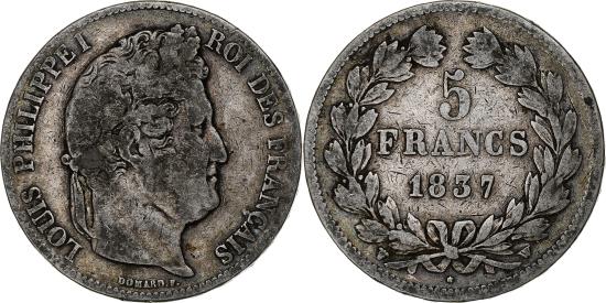 | | Coin, France, Louis-Philippe, 5 Francs, 1837, Lille, , Silver | | | Louis-Philippe, Laureate head right, Mint marks at edge outside wreath | | FEATURES |