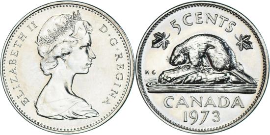 | | Coin, Canada, Elizabeth II, 5 Cents, 1973, Royal Canadian Mint, Ottawa | | | Queen's bust right, Beaver on rock divides date and denomination, Arnold Machin | | FEATURES |