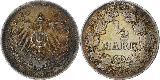 | | GERMANY - EMPIRE, 1/2 Mark, 1916, Berlin, , Silver, KM:17 | | | Denomination within wreath, Crowned imperial eagle with shield on breast within wreath, Some coins dated from 1918-19 were issued with a black finish to prevent hoarding. | | FEATURES |