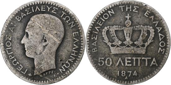 | | Greece, George I, 50 Lepta, 1874, Paris, , Silver, KM:37 | | | Head left, Crown | | FEATURES |