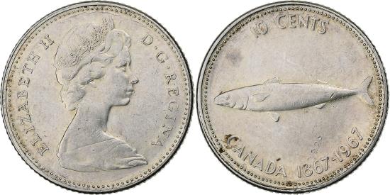 | | Canada, Elizabeth II, 10 Cents, 1967, Royal Canadian Mint, Ottawa, | | | Bust right, Atlantic mackeral left, denomination above, dates below | | FEATURES |