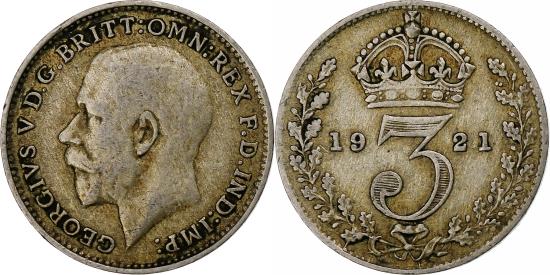 | | Coin, Great Britain, George V, 3 Pence, 1921, , Silver, KM:813a | | | Head left, Crowned denomination divides date within oak wreath, Bertram MacKennal | | FEATURES |