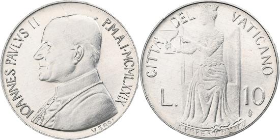 | | VATICAN CITY, John Paul II, 10 Lire, 1979, Rome, Aluminum, , KM:143 | | | Bust left, Cardinal Virtues - Temperance | | FEATURES |