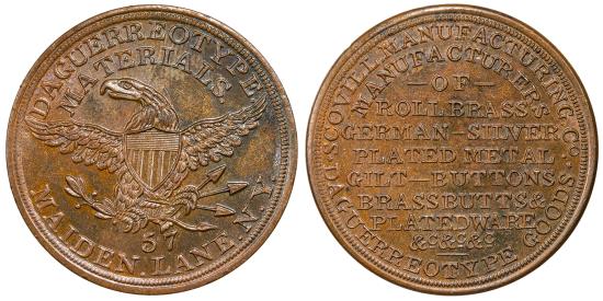 Merchant Token 28mm. 9.93g. Eagle displayed, shield on breast, arrows and olive branch in talons. DAGUERREOTYPE / MATERIALS. / 57 / MAIDEN . LANE . N.Y. SCOVILL MANUFACTURING. CO. / MANUFACTURERS / OF / ROLLBRASS / GERMAN-SILVER / PLATED METAL / GILT-BUTTONS / BRASSBUTTS & / PLATEDWARE / &c&c&c Rulau NY-802 Mottled medium brown color with flashy fields.