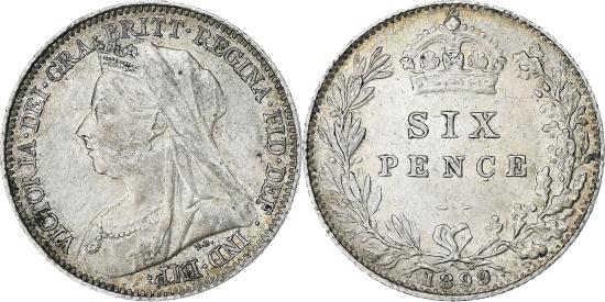 | | Great Britain, Victoria, 6 Pence, 1899, Silver, , KM:779 | | | Mature draped bust left, Crowned denomination within oak wreath, VICTORIA <Bullet> DEI <Bullet> GRA <Bullet> BRITT <Bullet> REGINA <Bullet> FID <Bullet> DEF <Bullet> IND <Bullet> IMP <Bullet> Thomas Brock | | FEATURES |
