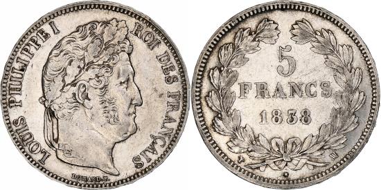 | | France, 5 Francs, Louis-Philippe, 1838, Marseille, Silver, | | | Louis-Philippe, Laureate head right, Mint marks at edge outside wreath | | FEATURES |