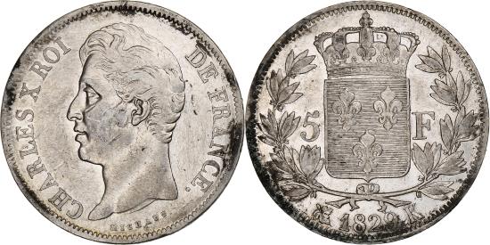 | | France, 5 Francs, Charles X, 1829, Bordeaux, Silver, , Gadoury:644 | | | Charles X, Type II, Crowned arms divide denomination within wreath | | FEATURES |