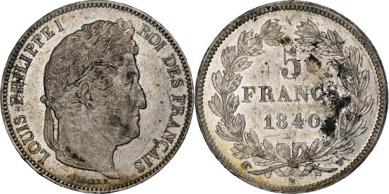 | | France, 5 Francs, Louis-Philippe, 1840, Lille, Silver, , Gadoury:678 | | | Louis-Philippe, Laureate head right, Mint marks at edge outside wreath | | FEATURES |