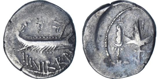 | | Marcus Antonius, Denarius, 32-31 BC, Traveling Mint, Silver, | | | Ship, right, with sceptre tied on prow., Aquila between two standards, This denarius comes from the strikes celebrating roman legions by Marc Antony. The off-centre strike of the reverse makes it impossible to determine for which legion this denarius was struck., ANT·AVG III·VIR·R·P·C, LEG [?] | | FEATURES |