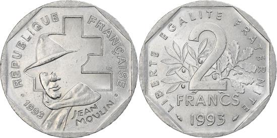 | | France, 2 Francs, Jean Moulin, 1993, Paris, Nickel, , Gadoury:547 | | | Jean Moulin, Bust with hat facing, double cross in background, Denomination on branches, date below, Emile Rousseau | | FEATURES |