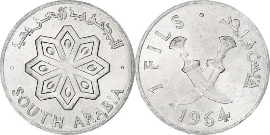 | | SOUTH ARABIA, Fils, 1964, Aluminum, , KM:1 | | | Snowflake design, Crossed swords | | FEATURES |
