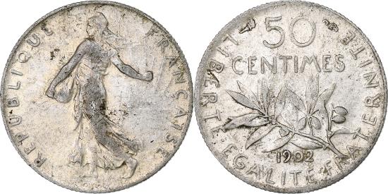 | | Coin, France, Semeuse, 50 Centimes, 1902, Paris, , Silver, KM:854 | | | Semeuse, Figure sowing seed, Leafy branch divides date and denomination, Without mint mark. | | FEATURES |