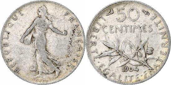 | | Coin, France, Semeuse, 50 Centimes, 1904, Paris, , Silver, KM:854 | | | Semeuse, Figure sowing seed, Leafy branch divides date and denomination, Without mint mark. | | FEATURES |