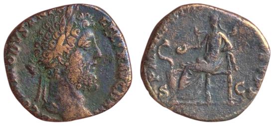 Commodus Æ Sestertius. Rome, AD 187-188. M COMMODVS ANT P FELIX AVG BRIT, laureate head right / P M TR P XIII IMP VIII COS V P P, Salus seated left, feeding out of patera in right hand a snake coiled around and rising from an altar; S-C across fields. RIC 512; MIR 18, 746-6/30; Banti 299. 22.08g, 30mm |