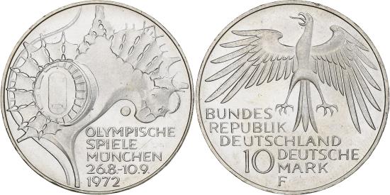 | | GERMANY - FEDERAL REPUBLIC, 10 Mark, 1972, Stuttgart, BE, Silver, | | | Eagle above denomination, Stadium - aerial view | | FEATURES |