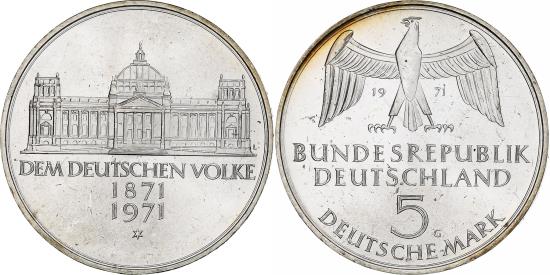 | | Coin, GERMANY - FEDERAL REPUBLIC, 5 Mark, 1971, Karlsruhe, Germany, | | | Eagle divides date above legend, denomination below, Reichstag building, in Berlin | | FEATURES |