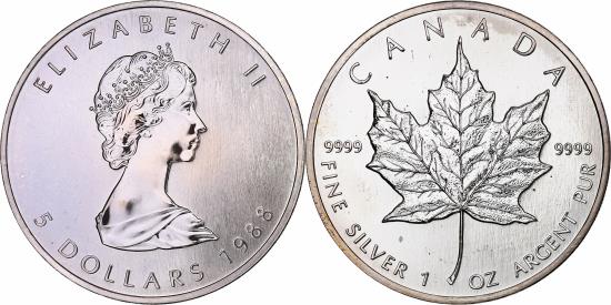 | | Canada, Elizabeth II, 5 Dollars, 1988, Royal Canadian Mint, Silver, | | | Young bust right, denomination and date below, Maple leaf flanked by 9999, Arnold Machin | | FEATURES |