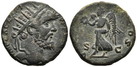 SEPTIMIUS SEVERUS. Ae, Dupondius reduced. 193 AD. Rome Mint. VICT (AVG TR P) COS. ; Victory advancing to left, holding wreath and palm