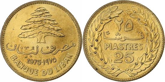 | | Lebanon, 25 Piastres, 1975, Nickel-brass, , KM:27.1 | | | Cedar tree above dates, Value within wreath | | FEATURES |