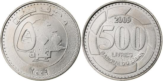| | Lebanon, 500 Livres, 2009, Nickel plated steel, , KM:39 | | | Arabic legend above large value on cedar tree, Large value 500, thick segmented circular border | | FEATURES |
