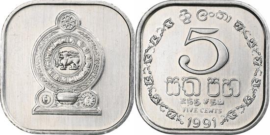 | | Sri Lanka, 5 Cents, 1991, Aluminum, , KM:139a | | | Value above designs within wreath, National arms | | FEATURES |