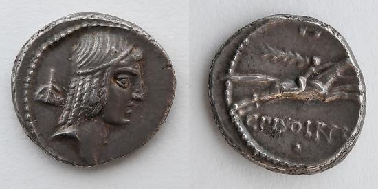 ROMAN REPUBLICAN: C. Calpurnius Piso L.f. Frugi, 67 or 61 BC, AR Denarius (18mm, 3.97g, 5h). Rome Mint, 67 BC. Obverse: Head of Apollo right, wearing taenia; symbol for 10,000 behind. Reverse: C•PISO•L•F•FRVG; rider on horse galloping right, reins in right hand, palm in left, two pellets above, pellet below. Crawford 408/1b, symbols 103/123. 10,000 is the large number behind the head of Apollo. "The modern Roman numerals D for 500 and M for 1000 were not used in ancient times; D is in fact a misreading of the Roman I? and the Romans wrote 1000 as CI?, again misinterpreted as M. 10000 was written CCI?? but the "Cs" on both side could be nested inside each other. 100000 was written CCCI??? (often nested) and its half 50000, split vertically, as CCCI; 100000 is quartered by splitting both vertically and horizontally, and nesting the "Cs", resulting in the numeral 25000. Hersh in his manuscript on symbols on Roman Republican coins describes this variety among coins that have a number on the obverse and a fractional number on the reverse. The single dot above and below on reverse are also numbers, in this case fractions, a single dot being 1/12 or an unciae." So the whole coin adds up to 10000.167. - Andrew McCabe. |