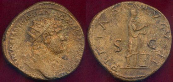 Brass 28mm, 15.7 grams Dupondius O:IMP CAESAR TRAJAN HADRIANVS AVG PM TRP COS III, radiate crowned bust facing right R:PIETAS AVGSTI S-C, Pietas standing right with r. hand rised holding incense box, altar at feet Good portrait of Hadrian and very bold details to the reverse with Pietas