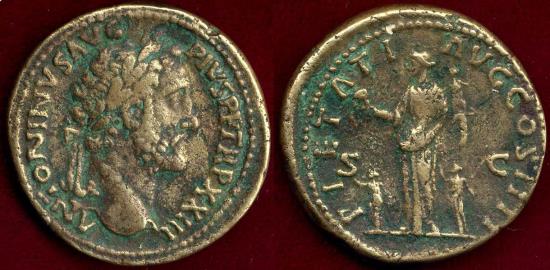 good brass color brass sestertius 33mm 26.46 grams O:ANTONINVS AVG PIVS PP TRP XIII, laur. bust facing r. R: PIETATI AVG COS IIII SC, Pietas standing l. between 2 childen holding globe & supporting 2 children on arm Catalog reference: RCV 4205