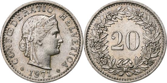 | | Switzerland, 20 Rappen, 1971, Bern, Copper-nickel, , KM:29a | | | Crowned head right, Value within wreath, Karl Schwenzer | | FEATURES |