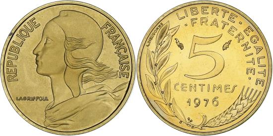 | | France, 5 Centimes, Marianne, 1976, Paris, FDC, Aluminum-Bronze, | | | Marianne, Liberty bust left, Denomination above date, grain sprig below, laurel branch at left, 1991-1993 dated coins, non-Proof exist in both coin and medal alignment., Henri Lagriffoul | | FEATURES |