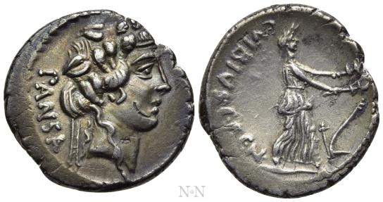 Obv: PANSA.Head of young Bacchus (or Liber) right, wearing ivy wreath.Rev: C VIBIVS C F C N.Ceres advancing right, holding torch in each hand; plow to right.