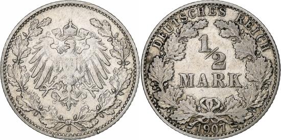 | | GERMANY - EMPIRE, 1/2 Mark, 1907, Hambourg, Silver, , KM:17 | | | Denomination within wreath, Crowned imperial eagle with shield on breast within wreath, Some coins dated from 1918-19 were issued with a black finish to prevent hoarding. | | FEATURES |