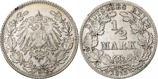 | | GERMANY - EMPIRE, 1/2 Mark, 1918, Munich, Silver, , KM:17 | | | Denomination within wreath, Crowned imperial eagle with shield on breast within wreath, Some coins dated from 1918-19 were issued with a black finish to prevent hoarding. | | FEATURES |