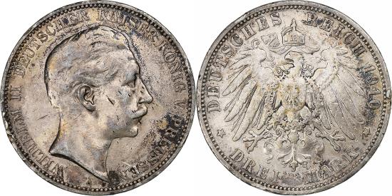 | | German States, PRUSSIA, Wilhelm II, 3 Mark, 1910, Berlin, Silver, | | | Head right, Crowned imperial eagle with shield on breast | | FEATURES |