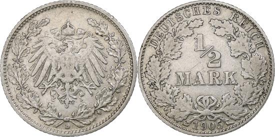 | | Coin, GERMANY - EMPIRE, 1/2 Mark, 1905, Munich, , Silver, KM:17 | | | Denomination within wreath, Crowned imperial eagle with shield on breast within wreath, Some coins dated from 1918-19 were issued with a black finish to prevent hoarding. | | FEATURES |