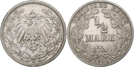 | | Coin, GERMANY - EMPIRE, 1/2 Mark, 1905, Karlsruhe, , Silver, KM:17 | | | Denomination within wreath, Crowned imperial eagle with shield on breast within wreath, Some coins dated from 1918-19 were issued with a black finish to prevent hoarding. | | FEATURES |
