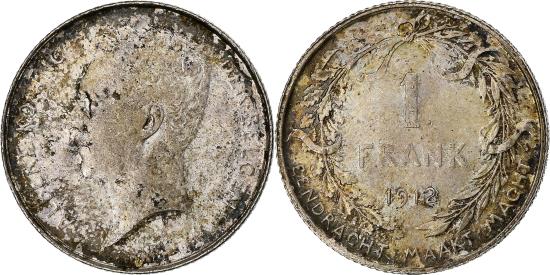 | | Belgium, Franc, 1912, Silver, , KM:73.1 | | | Head of Albert, left, legend in Dutch, Denomination above date within wreath, DER BELGEN | | FEATURES |