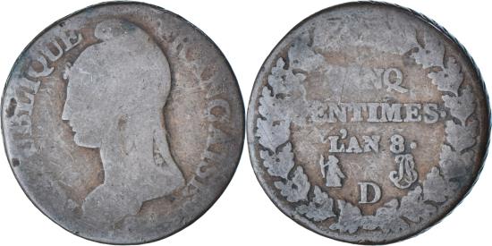 | | France, 5 Centimes, Dupré, AN 8, Lyon, Copper, , Gadoury:126a | | | FEATURES |