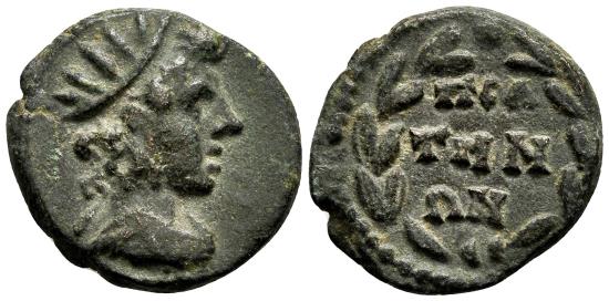 Obverse: Radiate and draped bust of Helios right. Reverse: ΠΕΛ-TH-NΩΝ. Legend in three lines within laurel (or olive) wreath. Excellent coin, looking much better in the hand than in the photo, in EF condition, conserving full details on both sides, very bold reliefs and a precious olive green patina. RPC online IV.2 2264. Peltai mint, circa AD 138-192. 1,85 g - 13,5 mm -------------------------------------------------------------------------------------------------- Visit our site about Numismatics and Archaeology: aeternitas-numismatics.com |