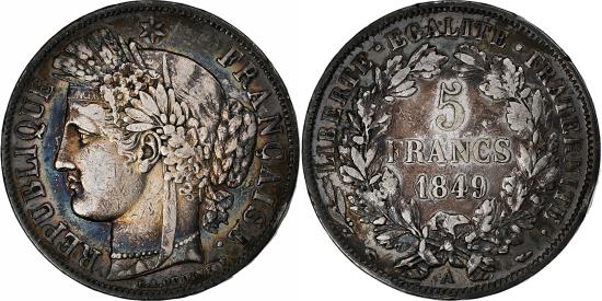 | | France, 5 Francs, Cérès, 1849, Paris, Silver, , Gadoury:719, KM:761.1 | | | Cérès, Liberty head with grain wreath left, Denomination within wreath | | FEATURES |